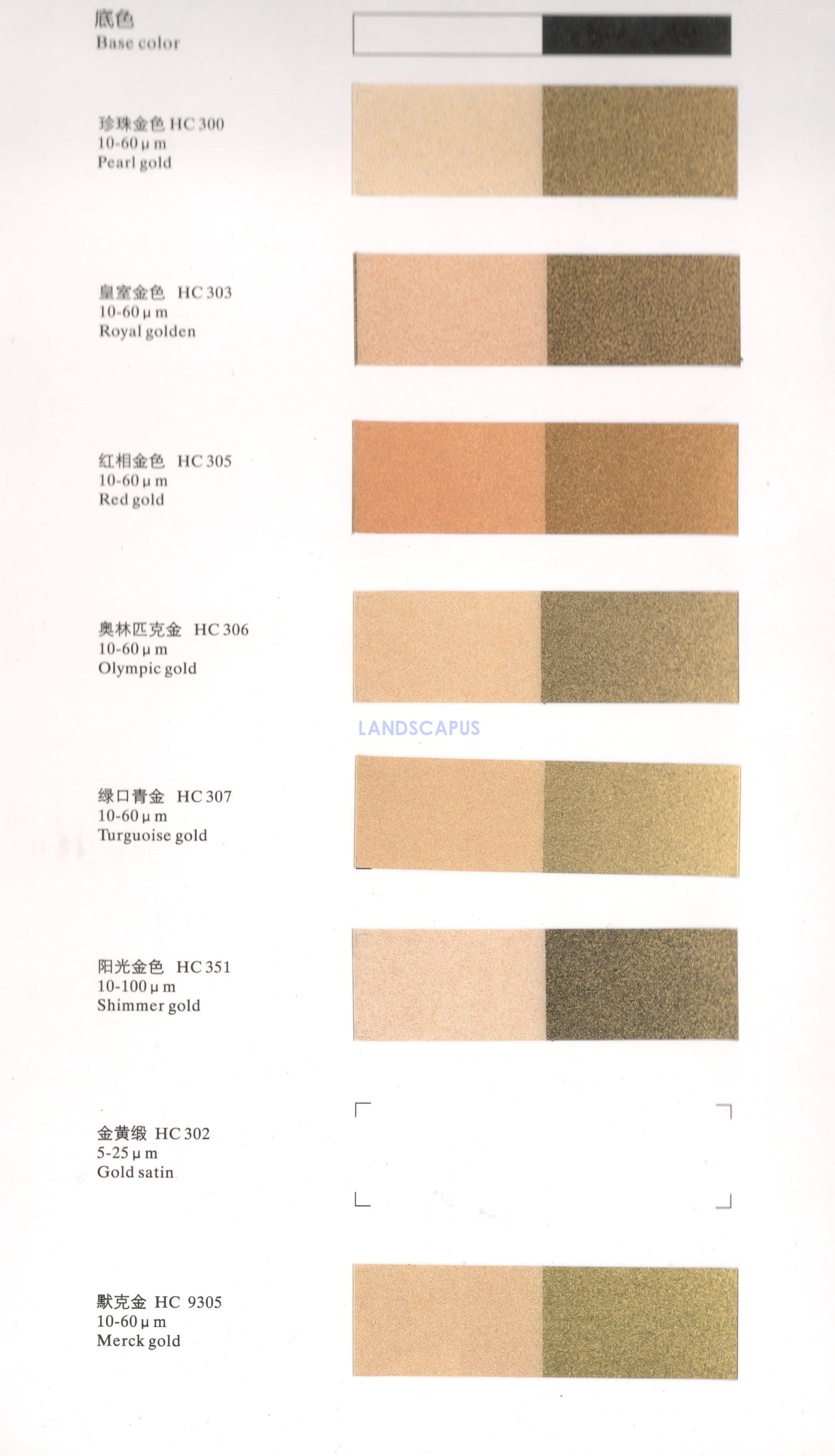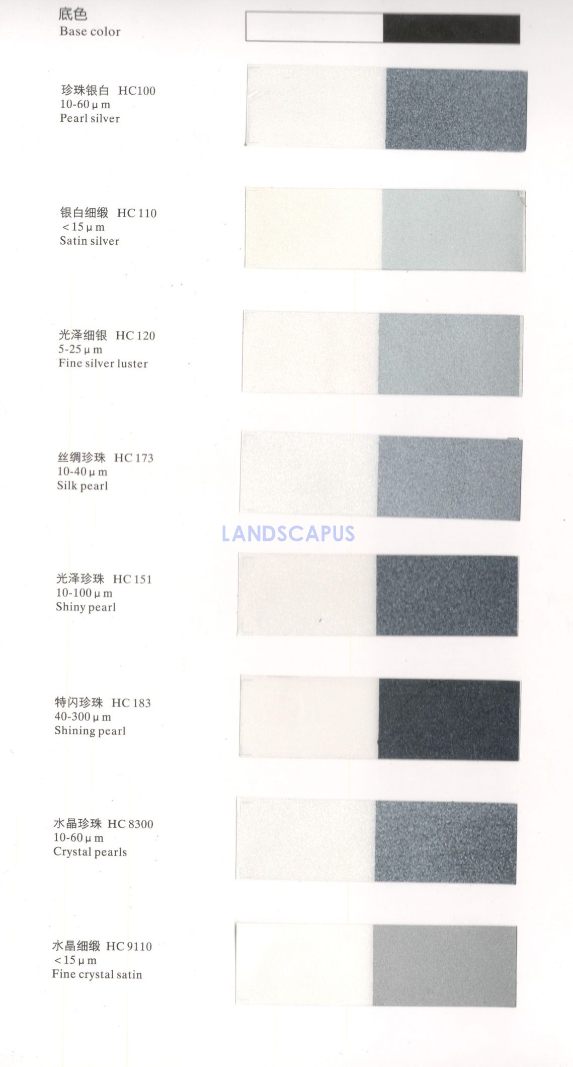 The HUANCAI Pearl Luster Pigments can be used in various industries, such as paints and coatings, plastics and master batches, printing inks, textile printings, rubbers,leather, paper and pulps, as well as cosmetics, etc.