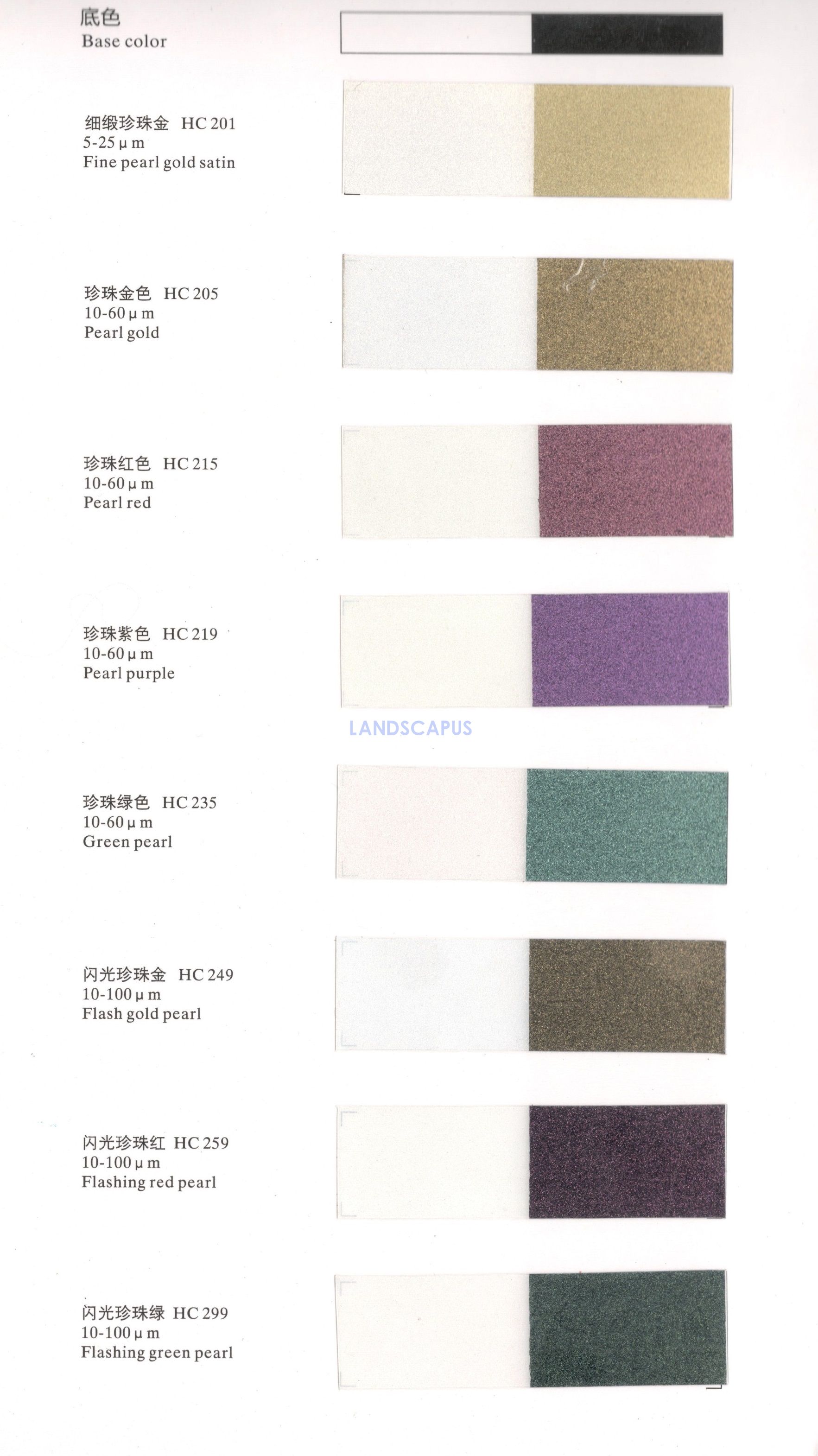 HUANCAI pearl Lustre Pigments are totally new type of Pigments. It has special pearl luster gloss and fascinating colors. Its characteristics of nontoxic and no pollution make it widely welcomed, and in place of the traditional pigments in more and more industrial fields.
